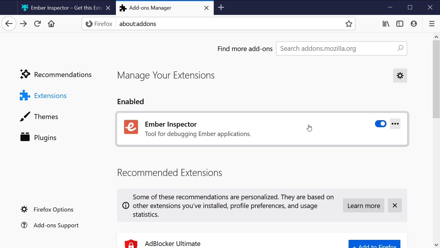 Once installed, go to an Ember application, open the Developer Tools, and click on the Ember tab at the far right.