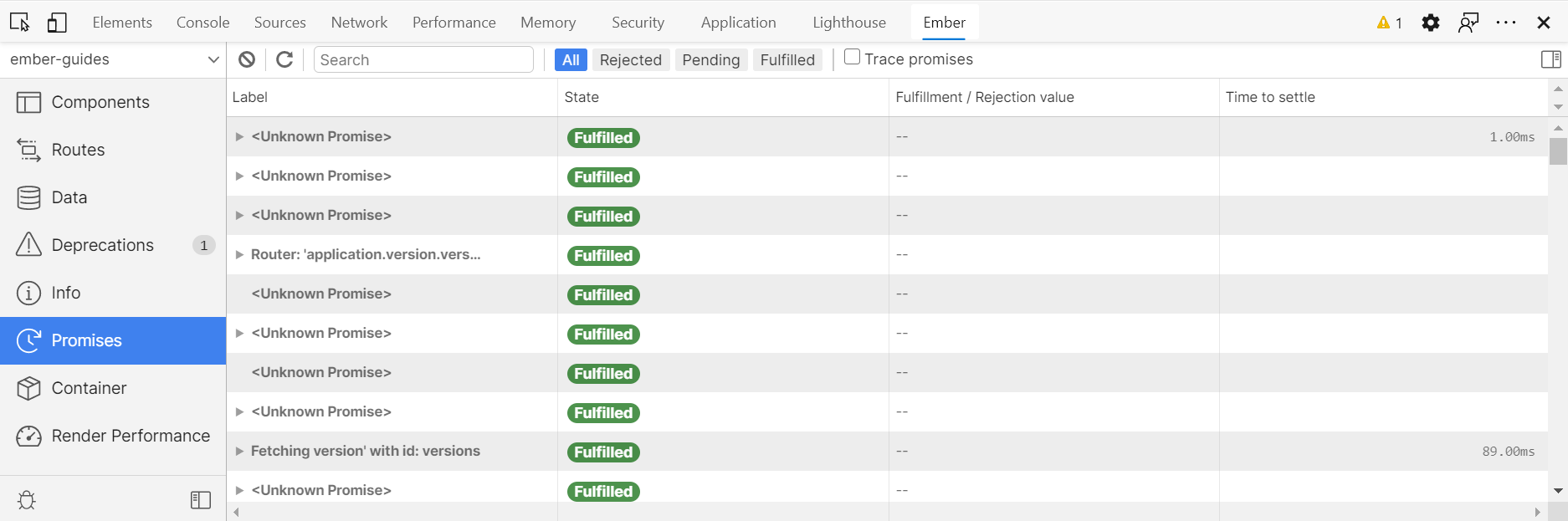 Promises generated by Ember are all labeled by default. You can also label your own RSVP Promises to find them in the Inspector's Promises tab. All RSVP methods can take a label as the final argument.